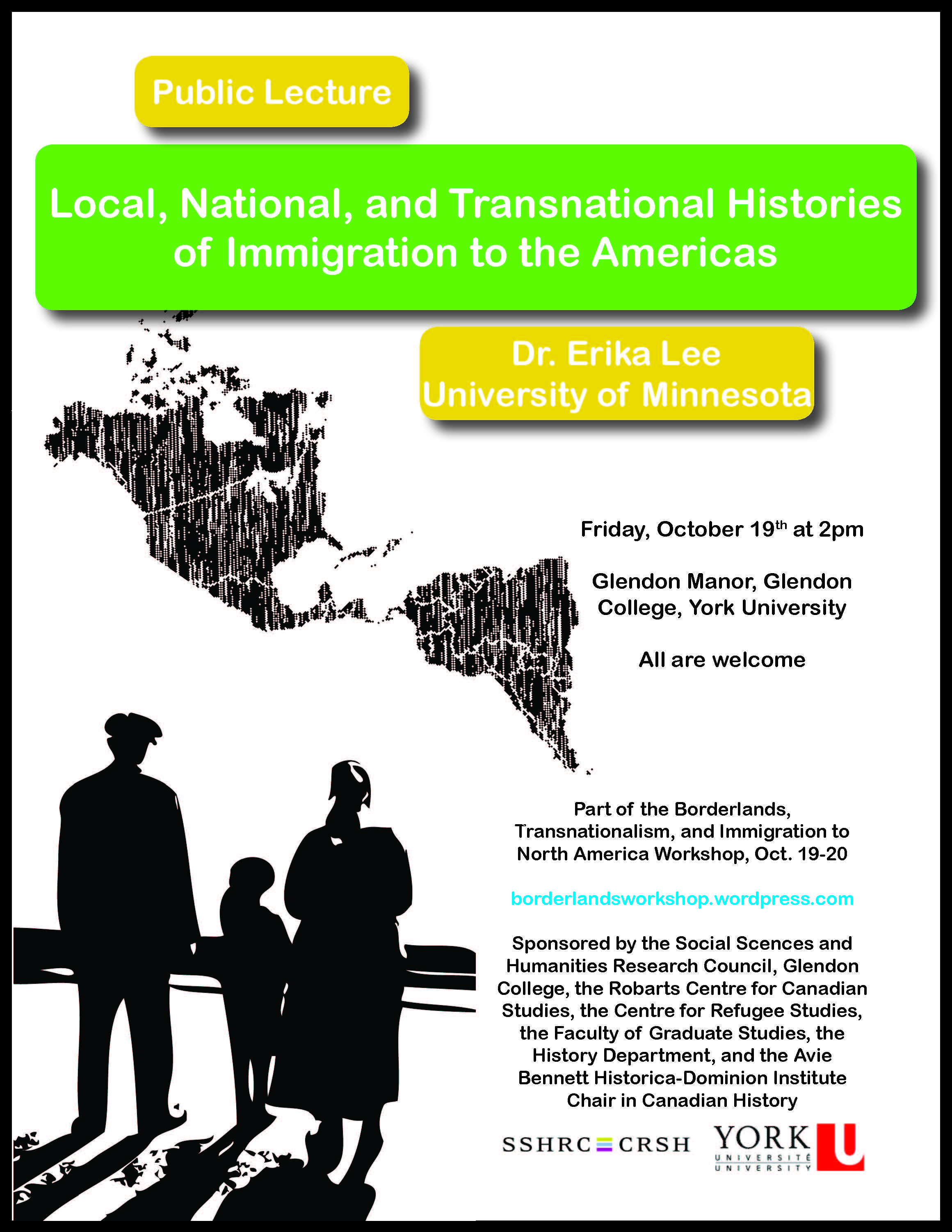 This Friday there are two public events at Glendon College in Toronto that explore the history of immigration to North America. They are part of the Borderlands Workshop, organized by a group of scholars that includes my York History colleague Ben Bryce. Since the workshop brings together scholars of immigration history from across Canada and the United States, these events are sure to provide lively discussion of a very relevant topic. Click on the posters or scroll down for more information.